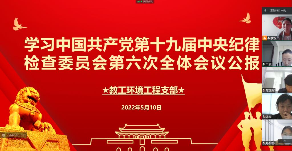 为认真学习领会中国共产党第十九届中央纪律委员会第六次全体会议公报精神,5月10日,环境工程学院教工环境工程支部采取网络会议的方式,开展“中国共产党第十九届中央纪律检查委员会第六次全体会议公报”专题学习会。支部书记申森主持会议,全体教工党员参加专题学习。