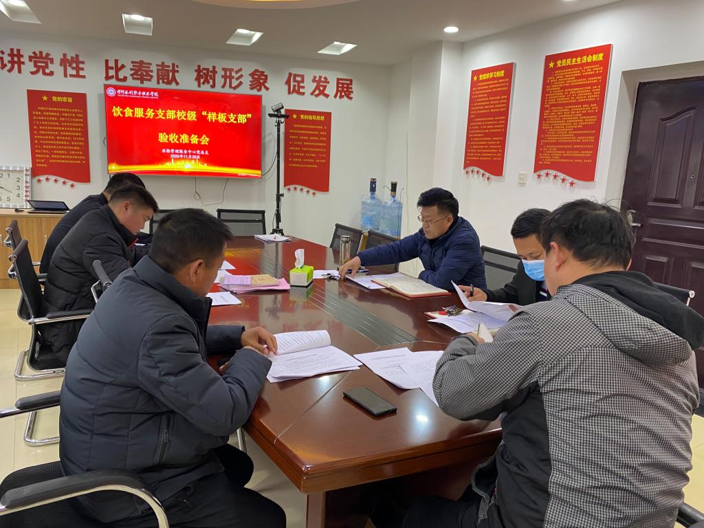 为了迎接学校党委组织部对“校级样板支部”的验收工作,11月25日下午,后勤管理服务中心党总支饮食服务支部在四楼会议室召开校级“样板支部”验收准备会,会议由总支书记王建设主持,总支组织委员、副主任王宁,饮食服务部支委以及总支办同志参加此次会议。