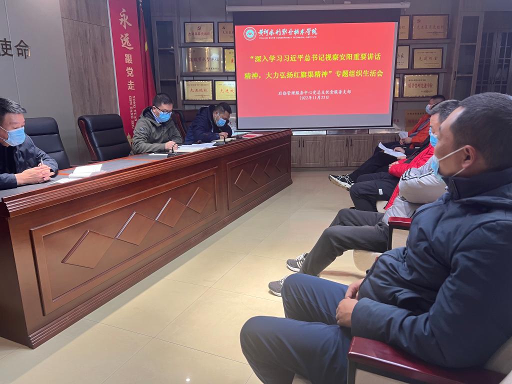 11月22日,饮食服务党支部在四楼党员之家召开“深入学习习近平总书记视察安阳重要讲话精神,大力弘扬红旗渠精神”专题组织生活会,会议由支部组织委员孔祥建主持,总支书记王忠伟以普通党员身份参加学习并作讲话。