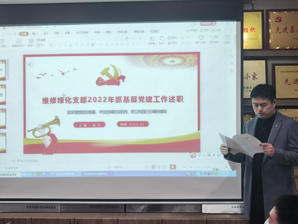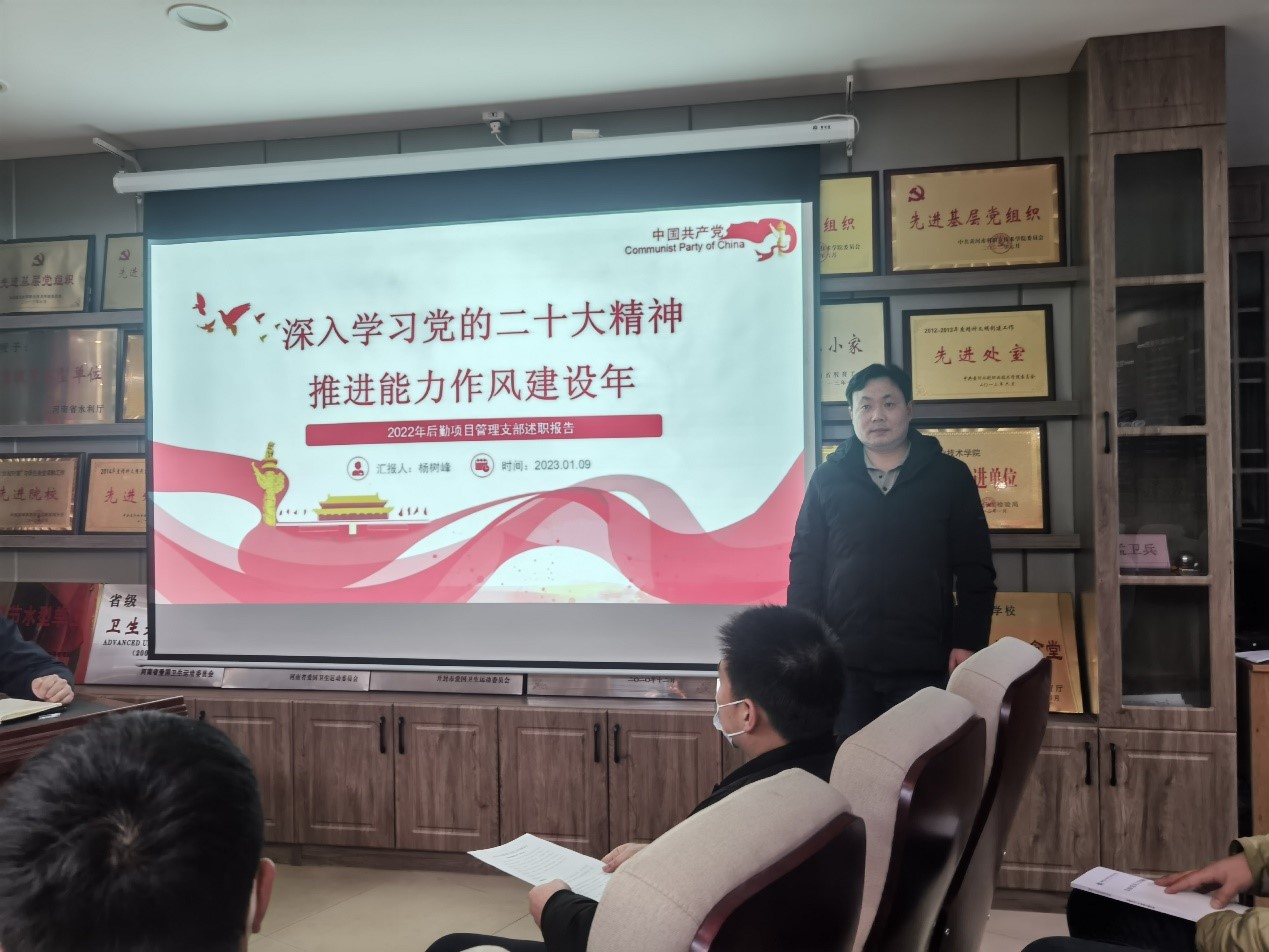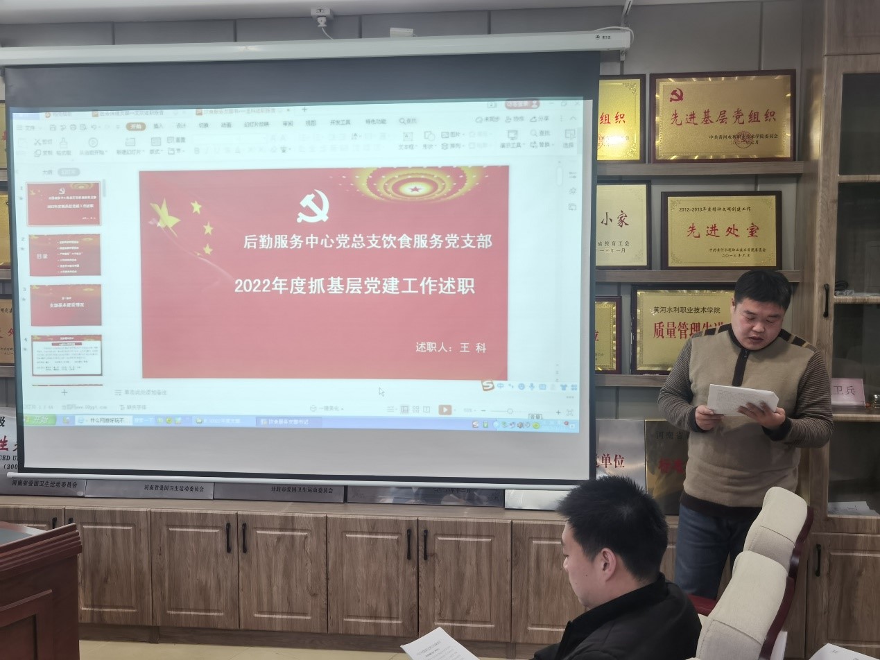 1月11日下午,后勤管理服务中心党总支在党员活动室召开2022年度基层党组织书记抓党建述职评议考核大会。会议由党总支书记王忠伟主持,后勤领导班子成员、总支委员、各支部书记、支部委员及部分党员代表参加会议。