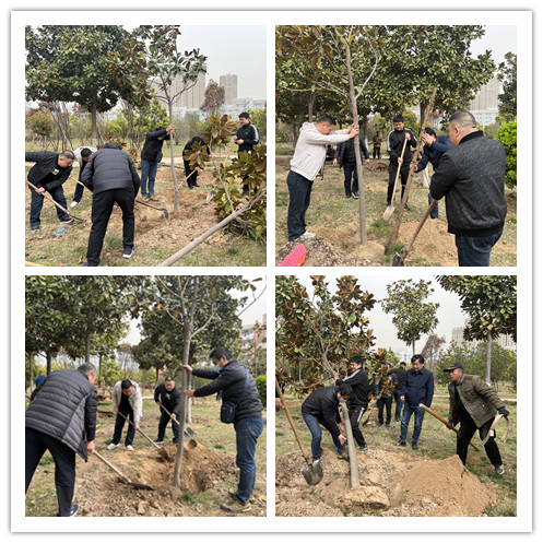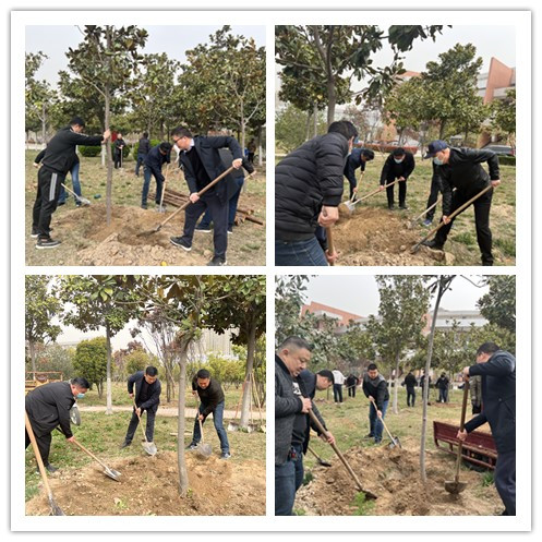 活动现场,大家团结协作,有的扶树填土,有的浇水施肥,干劲十足!现场呈现一片繁忙有序、热火朝天的劳动景象。经过大家辛苦的劳作,几十棵种植好的广玉兰迎风而立,展现出勃勃生机。