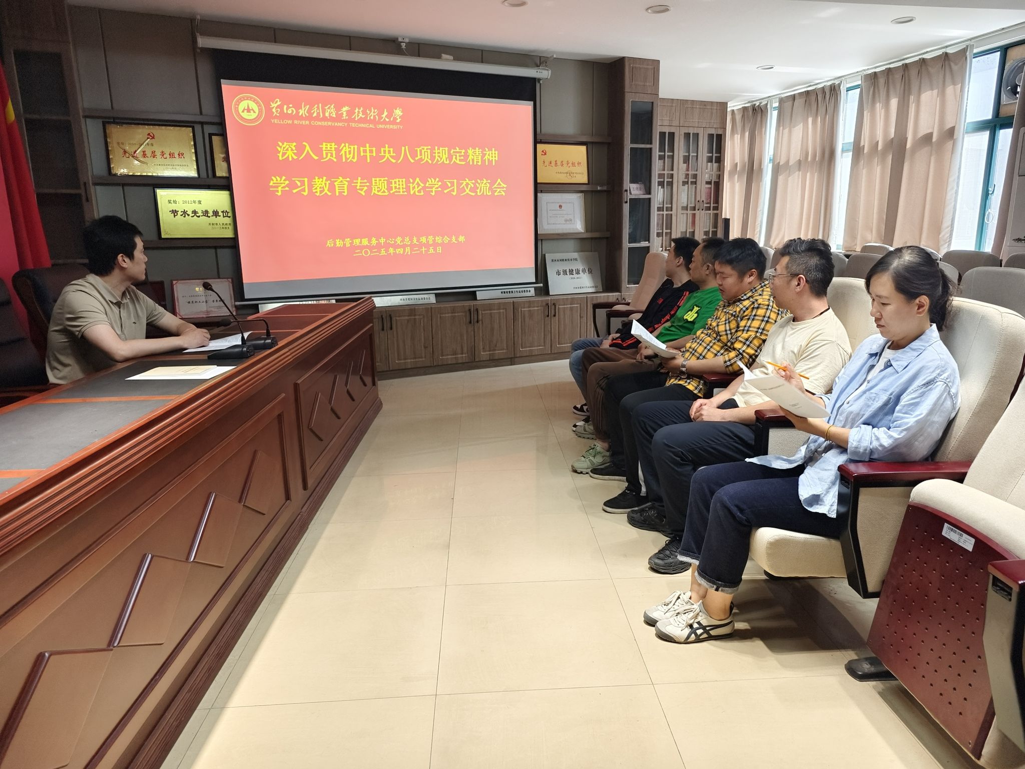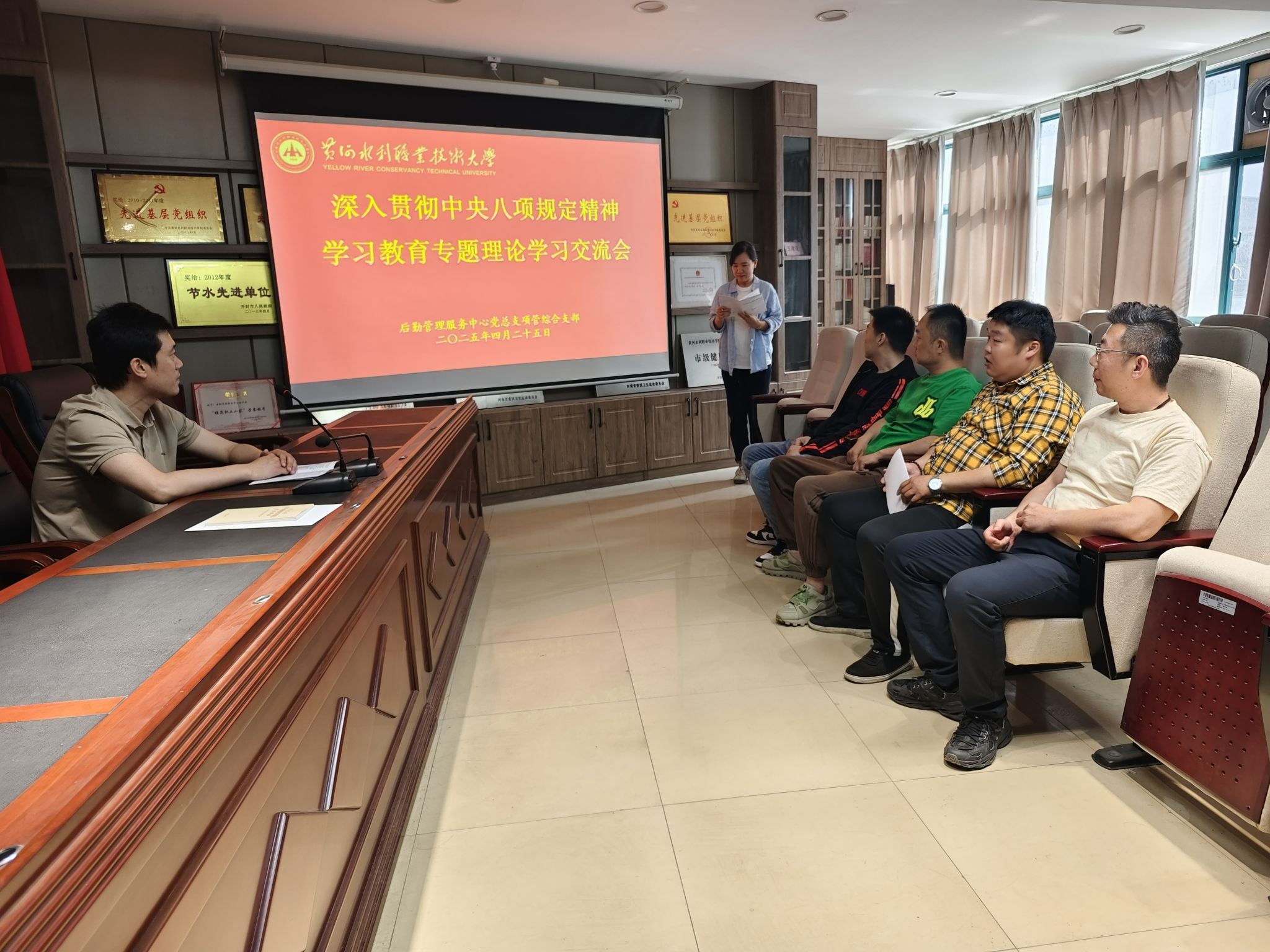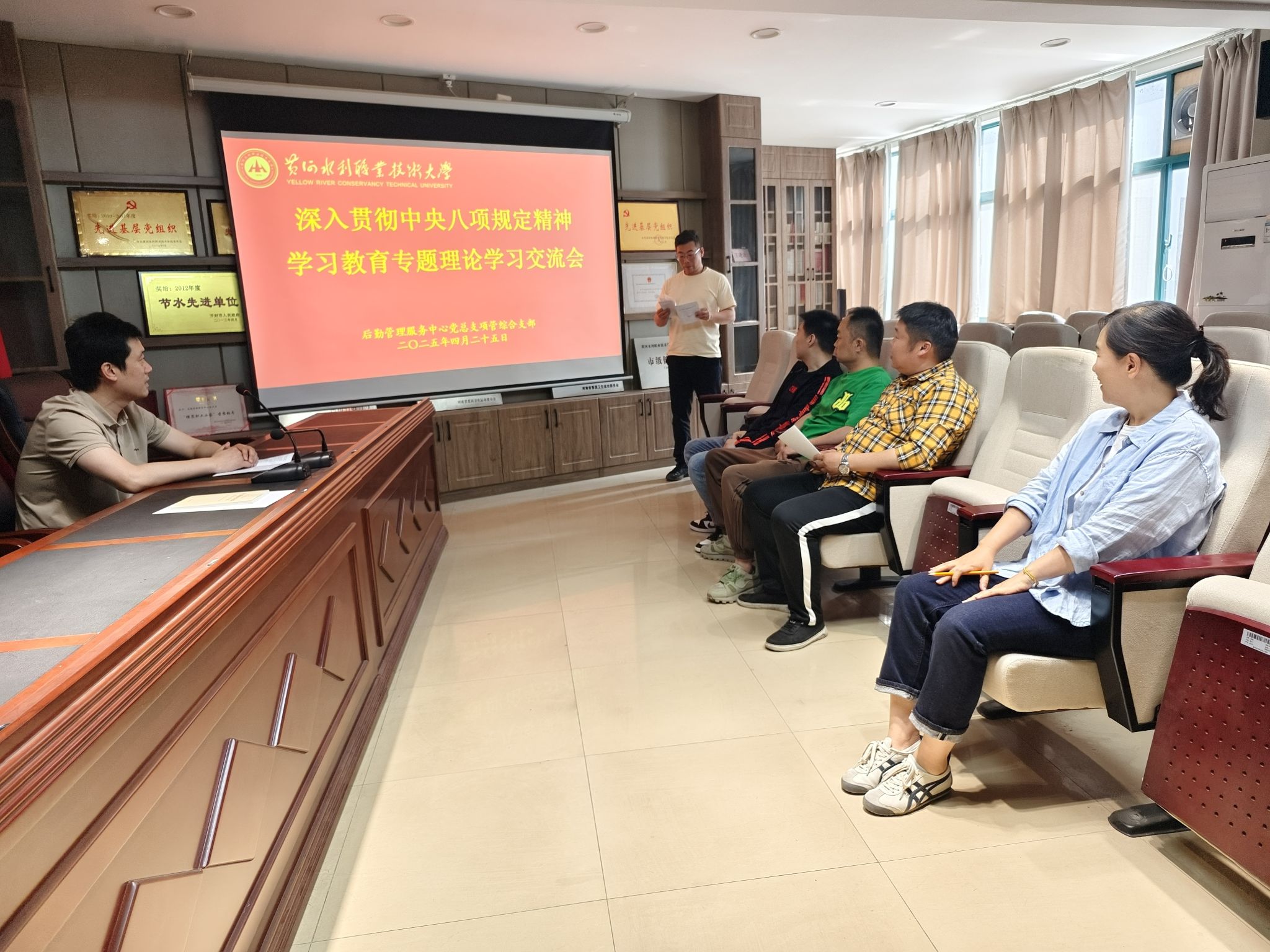4月25日,后勤管理服务中心党总支项管综合支部在党员活动室组织召开深入贯彻中央八项规定精神学习教育专题理论学习交流会,学习交流会由支部书记于滨主持,支部全体党员参加了学习交流。