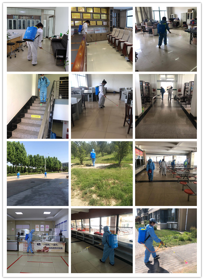 在后勤管理服务中心的精心安排下,专业消毒人员按照消杀规定,合理配置消毒液,对学校的教室、实训室、活动中心、食堂、宿舍、运动场等场所逐一实施消毒杀菌;对电梯、桌椅、餐桌、门把手、楼梯扶手、洗手池等高频接触部位密集反复消毒;对校园主干道、广场、花坛及各个楼道进行了全面清洗、药液喷洒。这次消毒确保所有场所无遗漏、所有部位无死角。同一时间,后勤有关部门负责人召集食堂工作人员、教学楼保洁进行防疫知识培训,对平时的消杀工作进行严格要求,确保师生用餐、上课环境安全卫生。校园防疫消杀涉及学校能否正常复学,涉及师生健康安全,通过环境卫生整治和消杀,进一步改善了学校环境卫生条件、提升了疫情防控和应对水平,为坚决遏制疫情传播构筑了一道坚实有效的安全防护网。