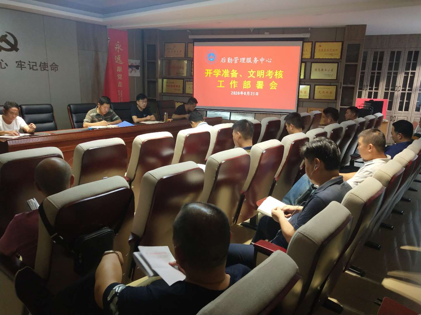 8月25日下午,后勤管理服务中心在党员之家组织召开新学期开学准备、文明考核工作部署会,会议由后勤管理服务中心党总支书记王建设主持,后勤领导班子成员和各部门经理参加会议。