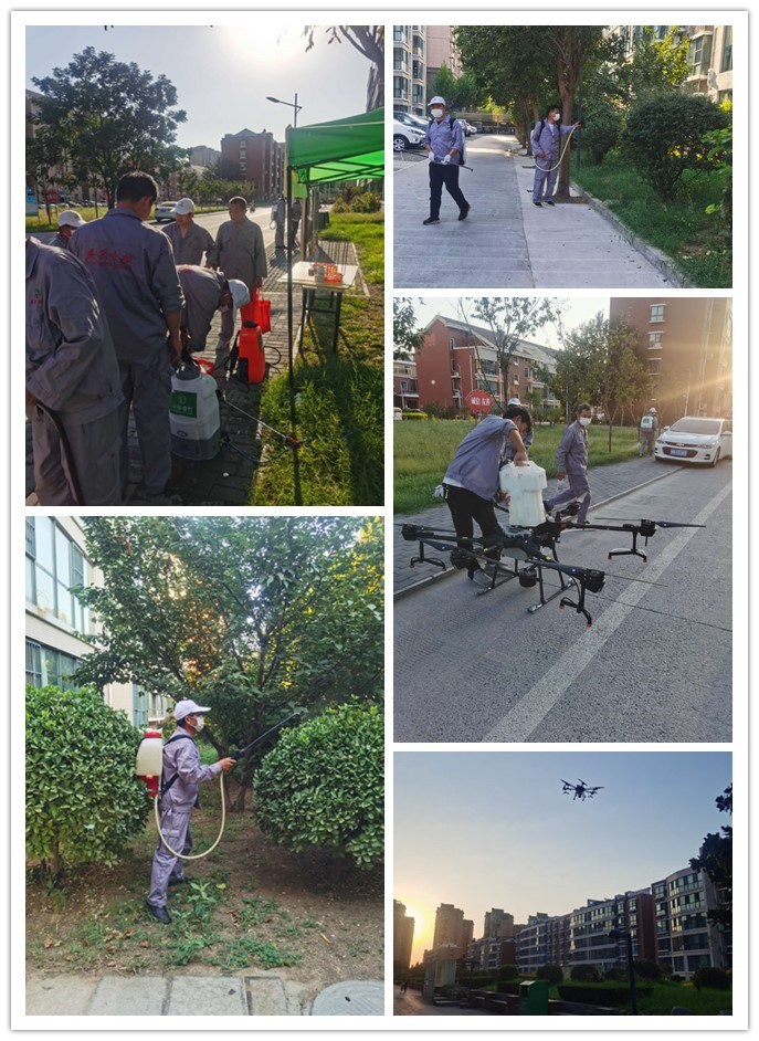里仁居家属院楼下的花草众多,而且生长茂密,容易滋生害虫,为全面灭虫,除人工喷洒外,还采用了无人机进行全方位、立体式、无死角喷洒,当天喷洒的药物药效可持续一周,基本可将花草树木上的害虫杀除干净,确保小区居民的健康生活。