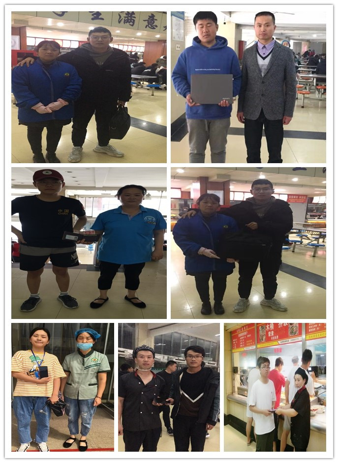 食堂管理服务科孔祥建科长说,食堂从业人员捡到钱包、手机、饭卡是常事,每每都是捡到物品及时上交,经确认后及时找到失主。截至目前学生食堂从业人员捡到笔记本电脑3台、钱包4个、手机42个、饭卡若干等,均悉数交还给失主,受到了学生的好评。食堂管理服务科对食堂职工拾金不昧的行为进行了通报表扬,号召全体职工以他们为榜样,争做社会主义核心价值观的信仰者、传播者、践行者。