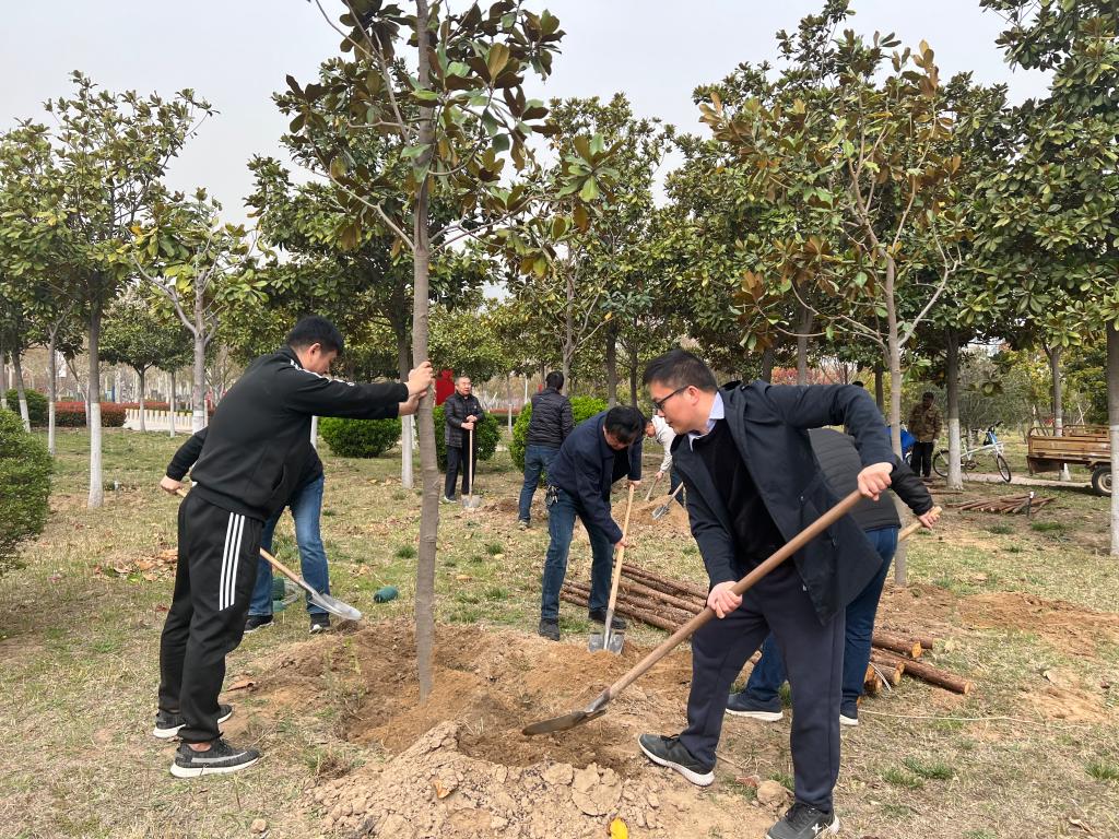 活动现场,大家团结协作,有的扶树填土,有的浇水施肥,干劲十足!现场呈现一片繁忙有序、热火朝天的劳动景象。经过大家辛苦的劳作,几十棵种植好的广玉兰迎风而立,展现出勃勃生机。