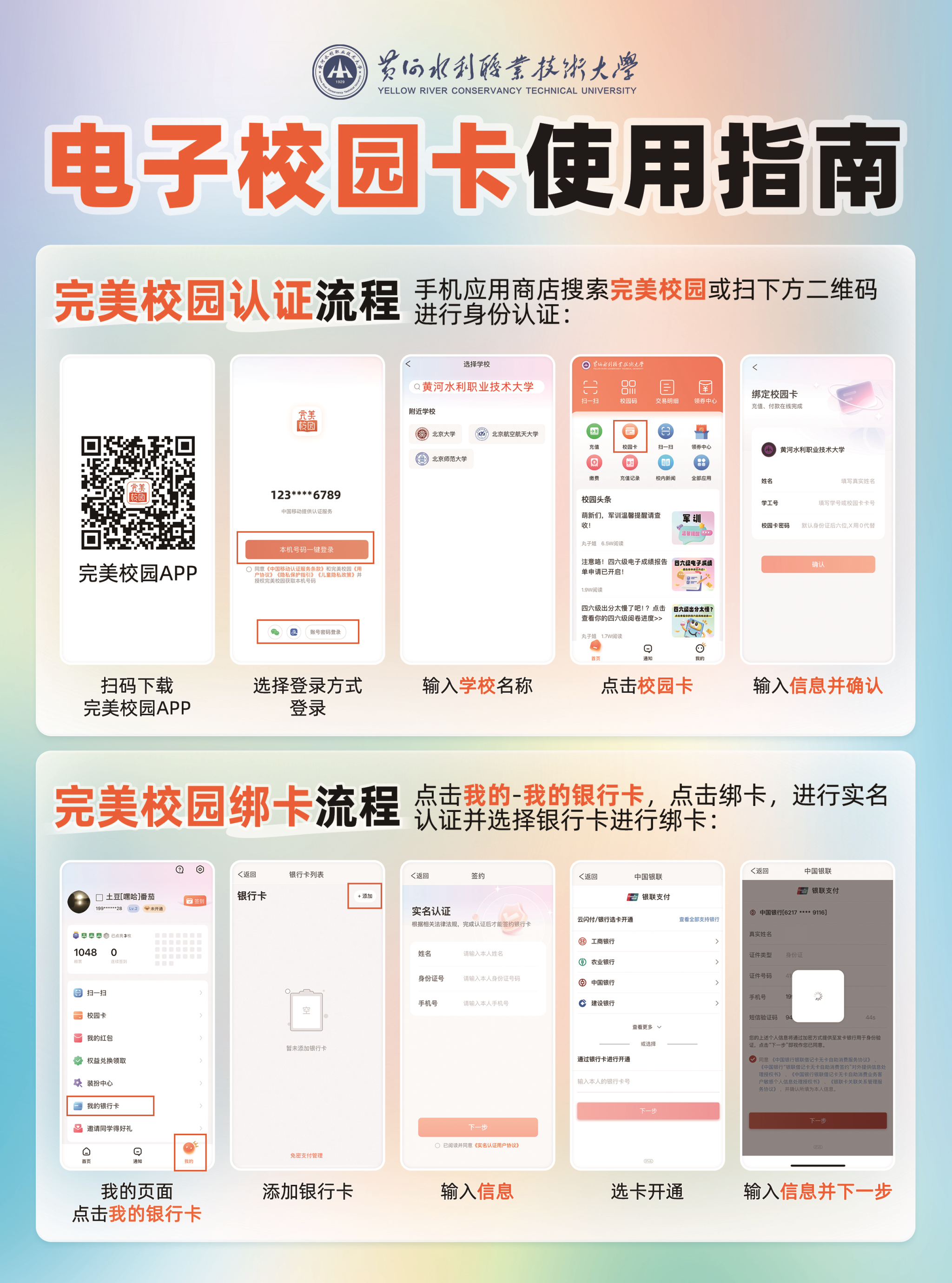 完美校园APP→我的→我的银行卡→添加,可通过输入相关提示信息及短信验证码方式绑定个人名下任意银行银行卡,后续电子校园码将支持银行卡支付的消费方式,大家可提前绑卡验证,敬请期待后续功能。