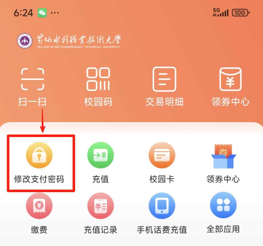 在开通电子支付校园码过程中,如果完美校园APP页面提示弱密码无法开通,请返回APP主页面,找到“修改支付密码”功能进行密码修改(支付密码采用数字形式,请勿使用字母或其它特殊符号),我校部分师生弱密码为:000000、888888、666666,修改成功后可使用新支付密码激活开通校园码,可通过电子校园码实现餐厅就餐扫码支付功能。