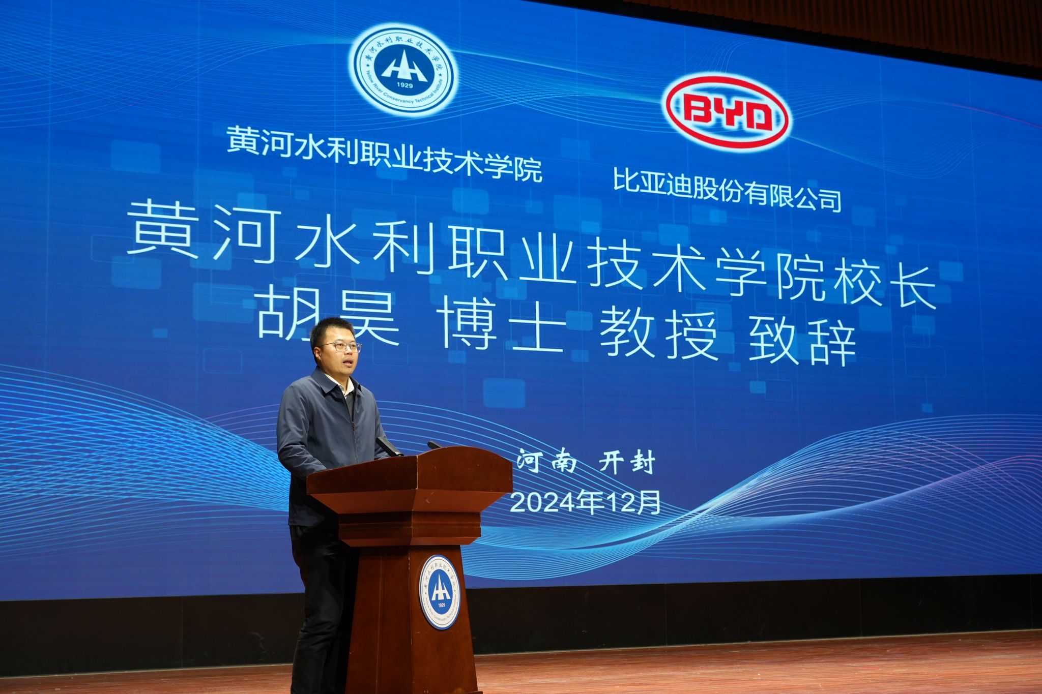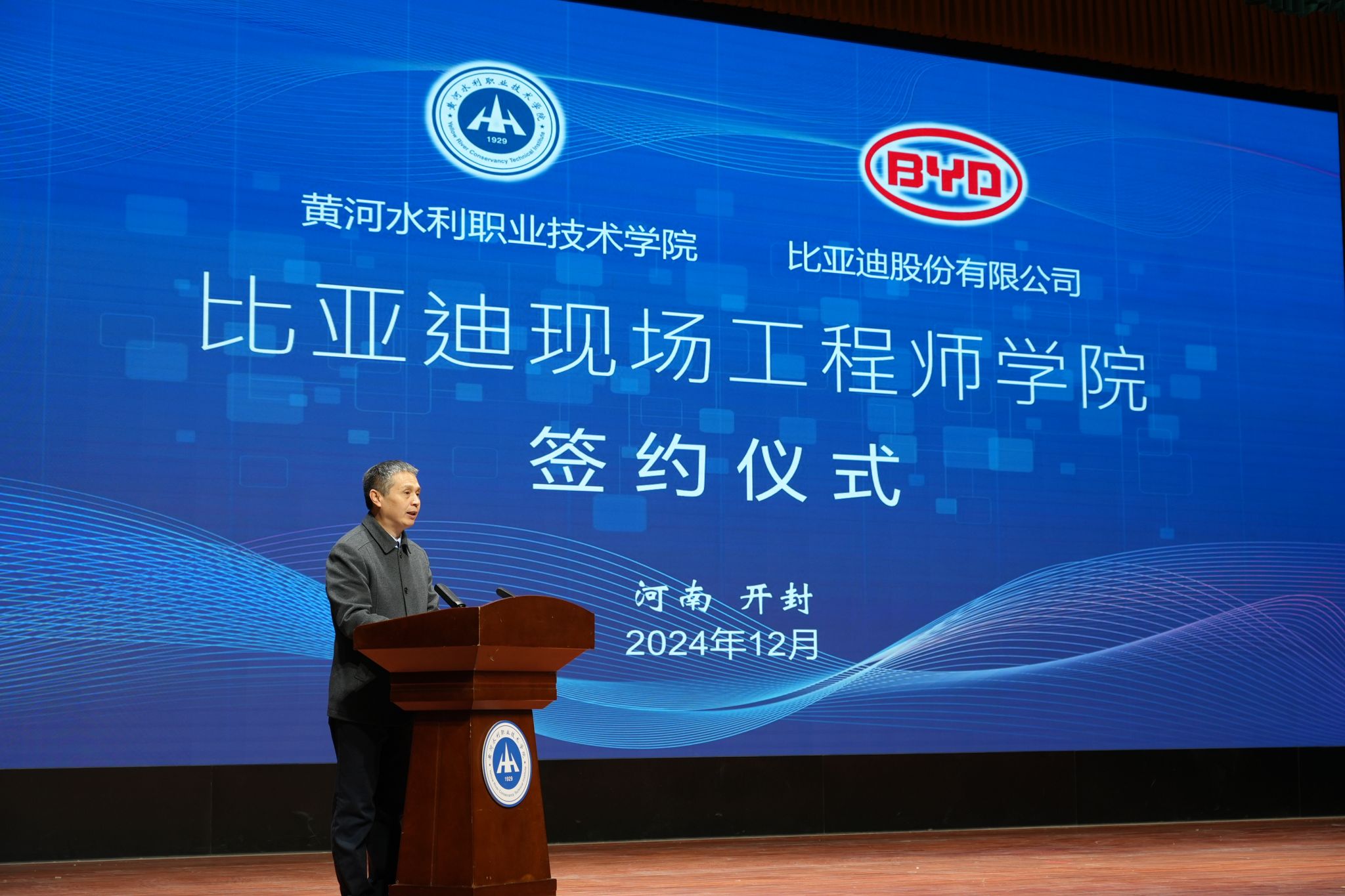 杨双喜在致辞中介绍了比亚迪股份有限公司的概况,以及在新能源汽车领域取得的成就。他表示,比亚迪将发挥企业优势,整合优质资源,与黄河水利职业技术学院在现场工程师学院建设方面共同探索,凝聚育人合力,构建长效合作机制,在专业建设、教学标准制定、教材开发和人才共育等方面,助力学校高质量发展,助力学生高质量就业,全流程服务培养新能源汽车产业链的人才。