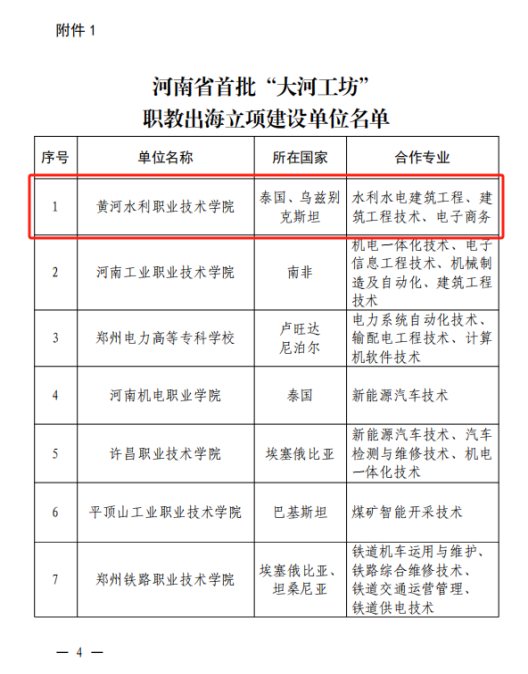 近日,河南省教育厅公布了《关于公布首批“大河工坊”职教出海建设项目的通知》(教职成〔2024〕364号),我校泰国大河工坊、乌兹别克斯坦大河工坊成功入选。