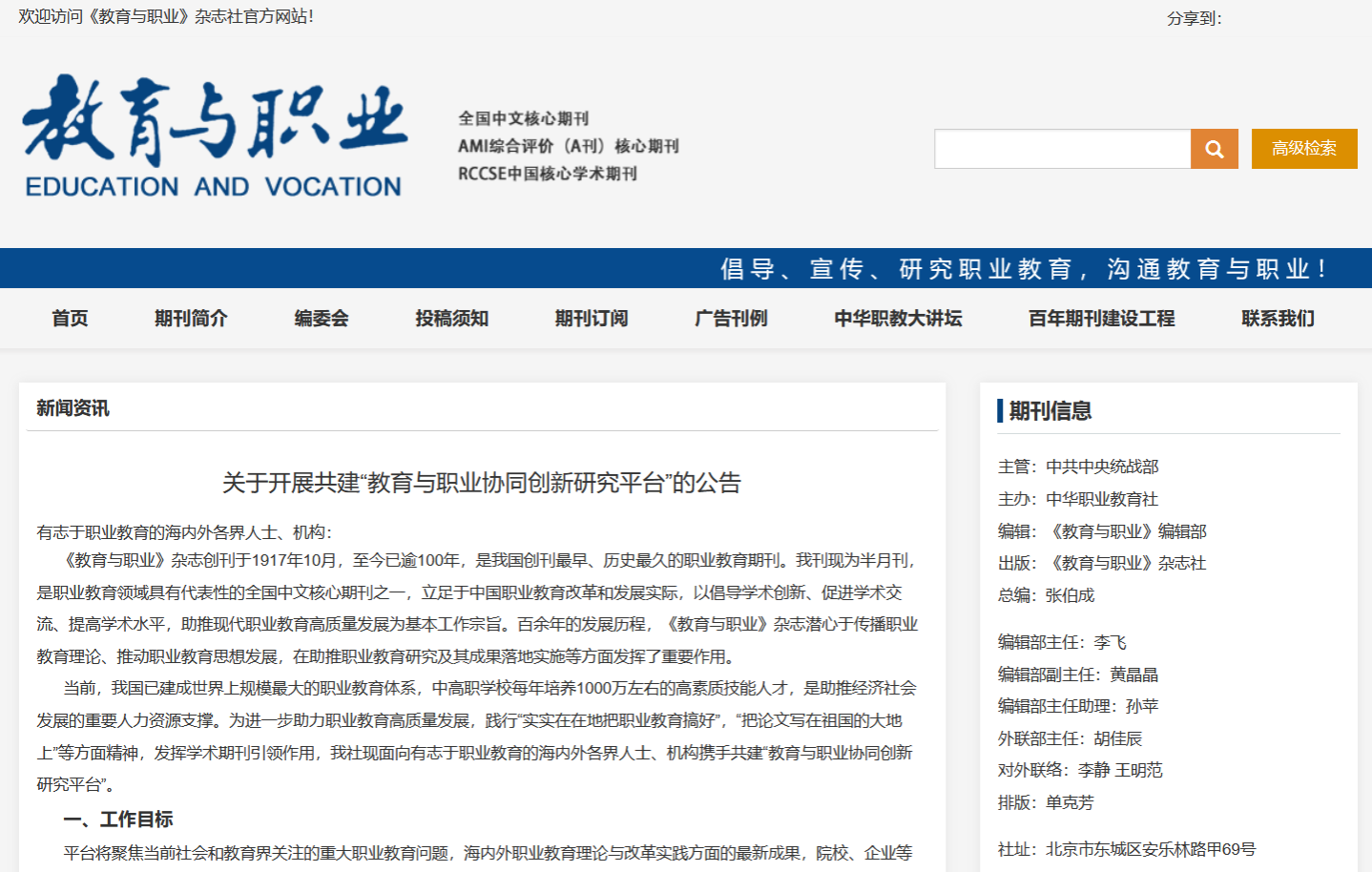 《教育与职业》杂志由中共中央统战部主管,中华职业教育社主办,创刊于1917年10月,至今已逾100年,是我国创刊最早、历史最久的职业教育期刊,是职业教育领域具有代表性的全国中文核心期刊之一。该刊立足于中国职业教育改革和发展实际,以倡导学术创新、促进学术交流、提高学术水平,助推现代职业教育高质量发展为基本工作宗旨。