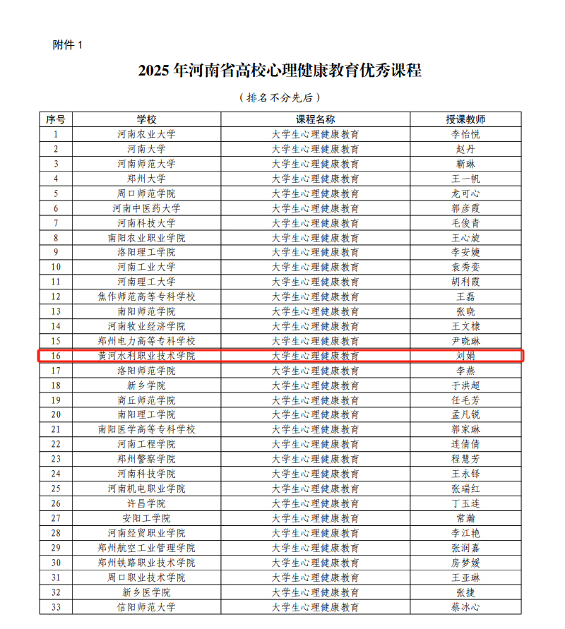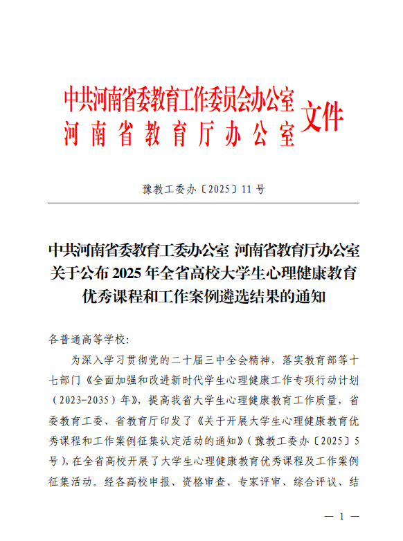 近日,河南省委教育工委、河南省教育厅公布了2025年全省高校大学生心理健康教育优秀课程及心理危机干预优秀案例遴选结果,我校刘娟老师主讲的《大学生心理健康教育》课程获评“2025年全省高校心理健康教育优秀课程”。此次评选活动自今年3月启动,经资格审查、专家评审、综合评议、结果公示等环节,评选出2025年全省高校心理健康教育优秀课程40个。
