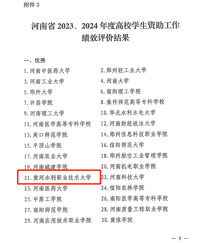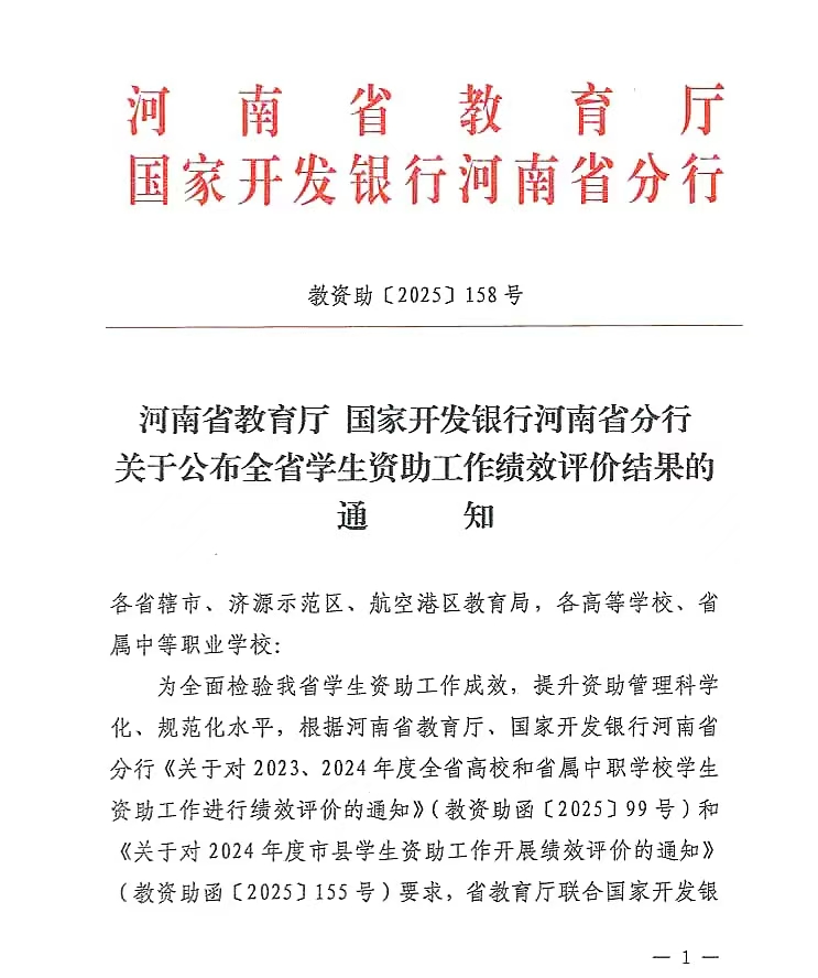为全面检验全省学生资助工作成效,提升资助管理科学化、规范化水平,省教育厅联合国家开发银行河南省分行组织开展了2023、2024年度全省高校、省属中职学校以及2024年度市县学生资助工作绩效评价。本次绩效评价通过单位自评、材料审核、问卷调查、实地复核等方式进行,于近日发布了评价结果,我校凭借优异的工作实绩、显著的育人成效和突出的创新案例,在全省高校中脱颖而出,再次获评“优秀”。