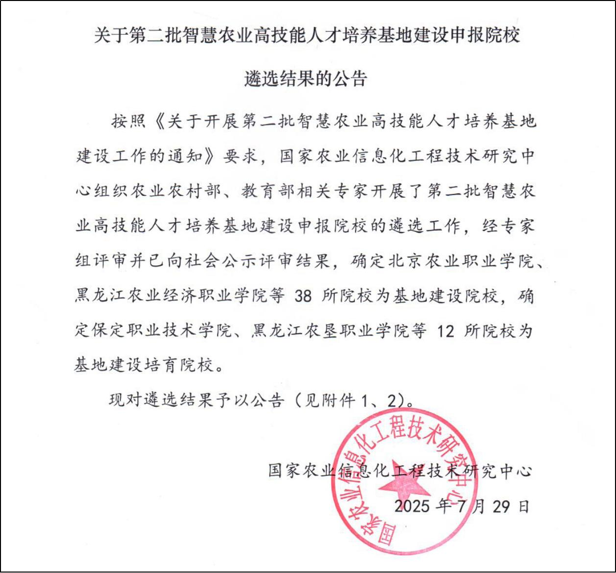 近日,国家农业信息化工程技术研究中心公布第二批智慧农业高技能人才培养基地建设申报院校遴选结果,我校依托农业水利工程职业本科专业成功申报该基地。这标志着学校在智慧农业复合型高技能人才培养领域迈入国家级建设梯队,将为推动农业数字化转型和乡村振兴战略实施注入新动能。