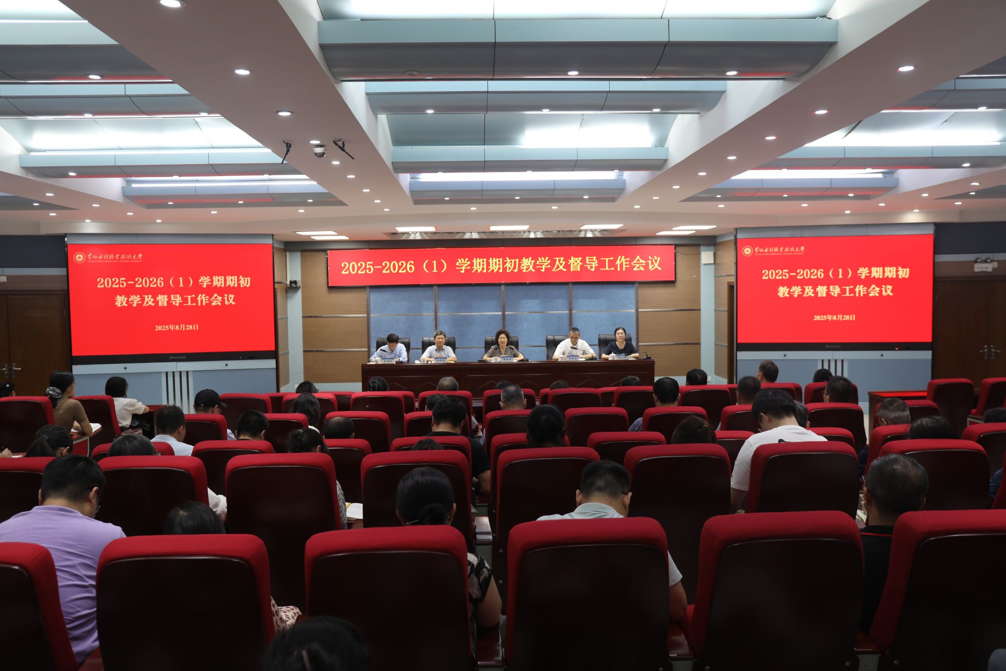 8月28日下午,我校在三号实训馆学术报告厅召开2025-2026学年第一学期期初教学及督导工作会议,校党委书记周保平、副校长朱焕立、纪委书记刘许亮出席会议。教务处、教育教学督导室全体成员及15个院(部)的院长(主任)、分管教学的副院长(主任),各学院的教学科研岗、基层教学组织负责人和校院两级督导专家等参会,会议由朱焕立主持。
