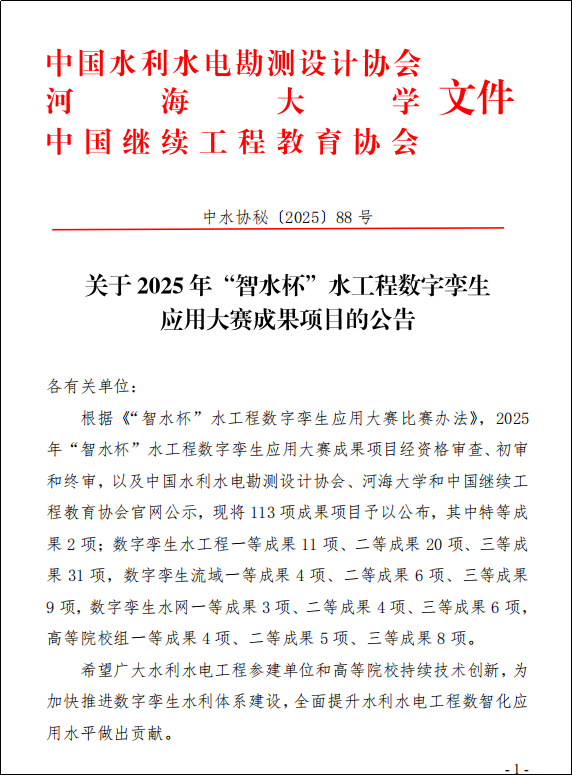 10月21日,数字孪生水工程技术交流会暨2025年“智水杯”水工程数字孪生应用大赛成果发布会在河海大学举行,我校水利工程学院工程制图教学团队参赛项目“某引黄涵闸规划阶段 BIM 模型集成及应用”获高等院校数字孪生成果二等奖。