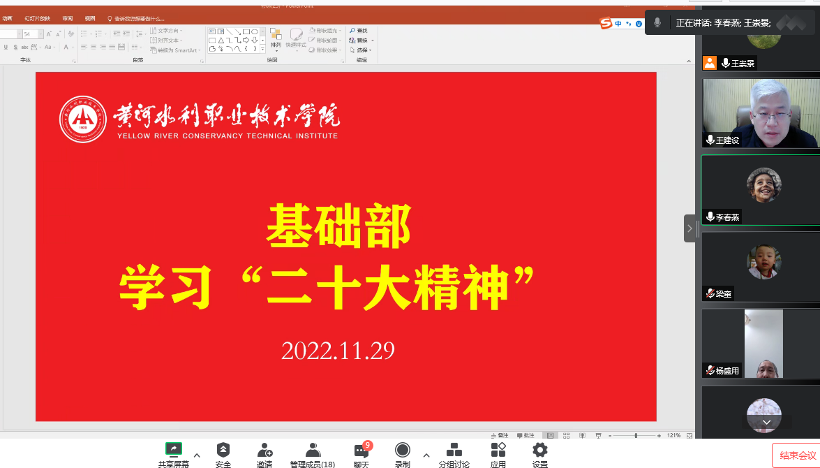 11月29日,基础部直属党支部全体党员通过腾讯会议的方式,集中学习党的二十大精神,会议由直属党支部书记王建设主持并领学。