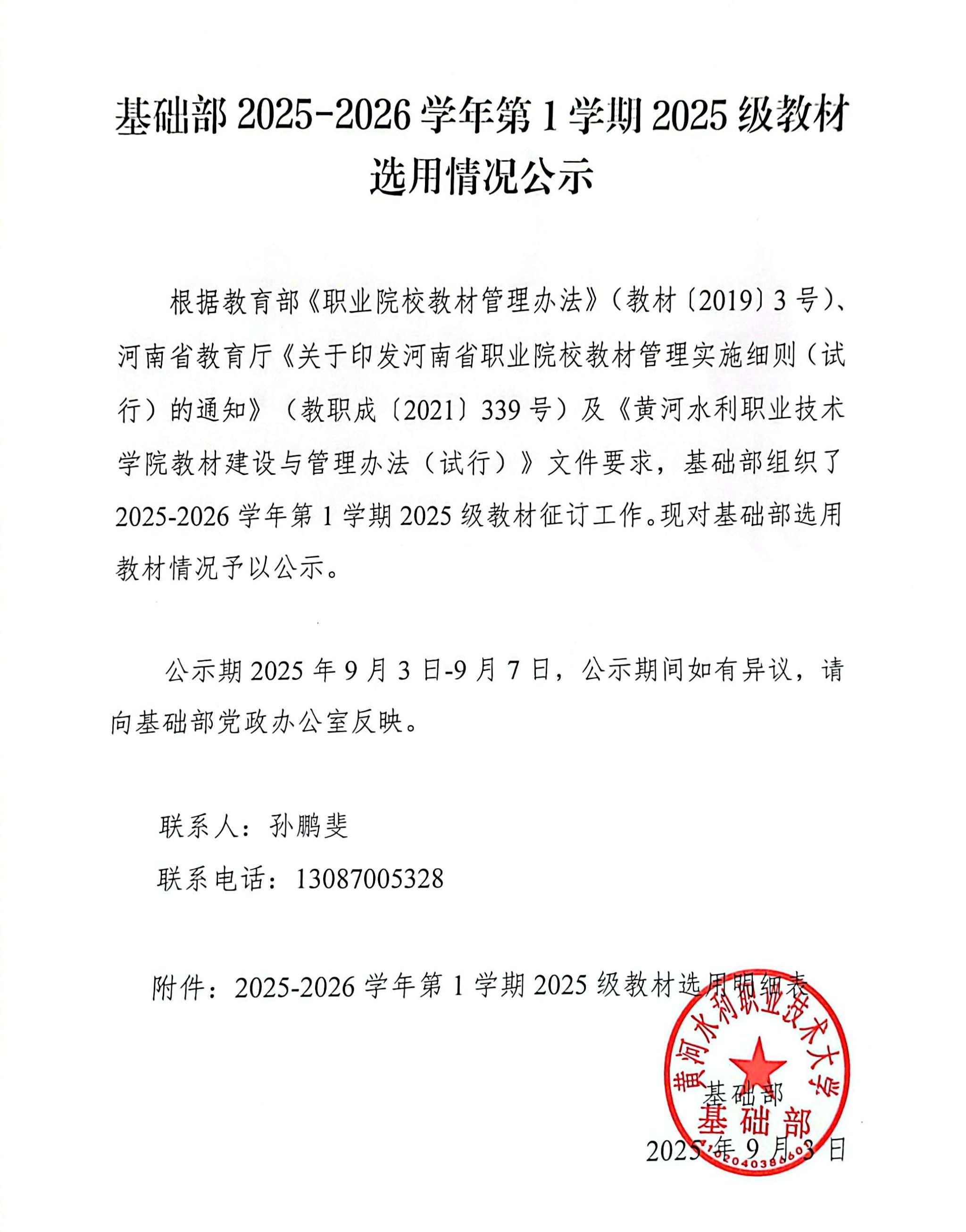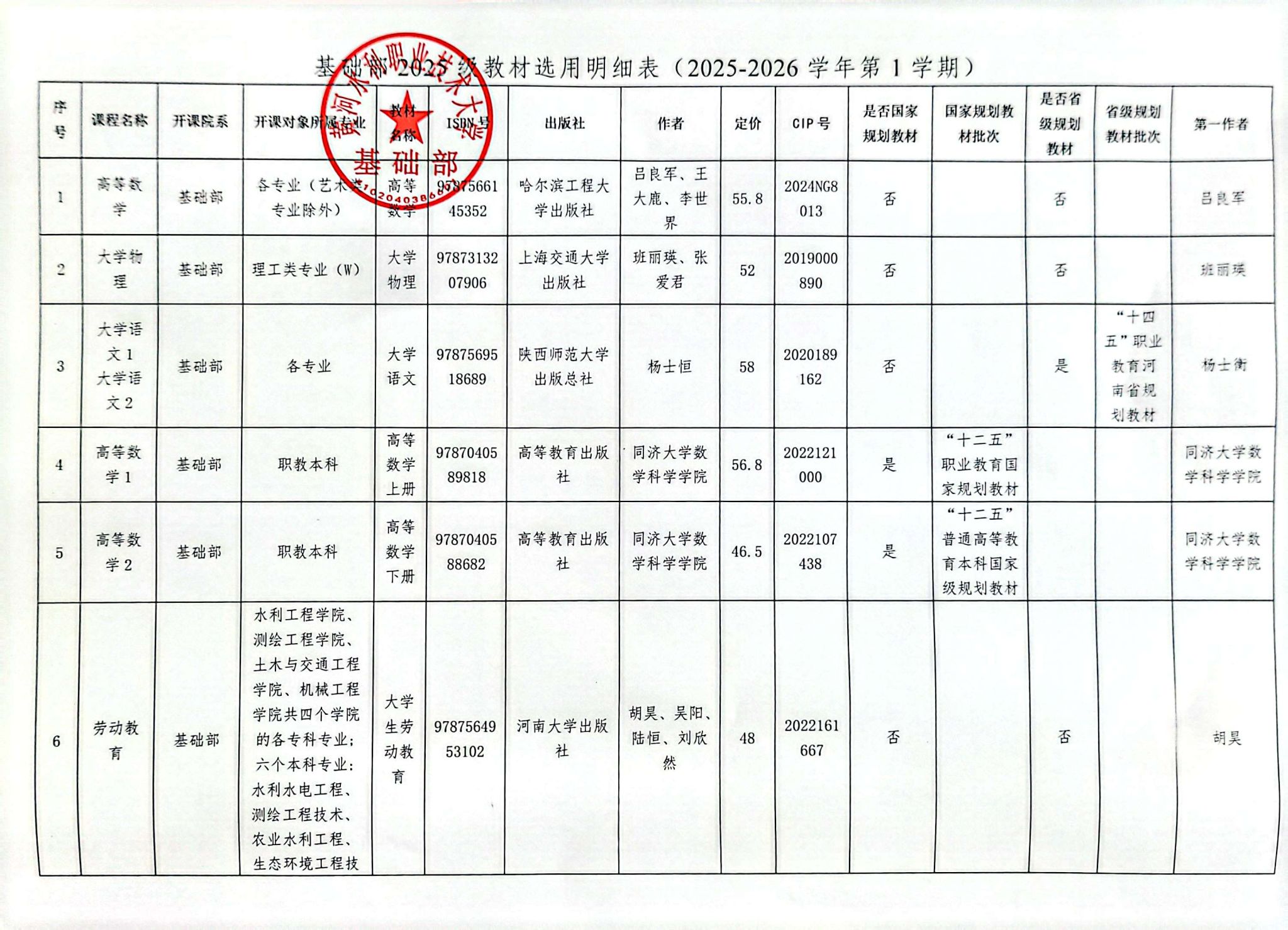 基础部2025-2026学年第1学期2025级教材选用情况公示
