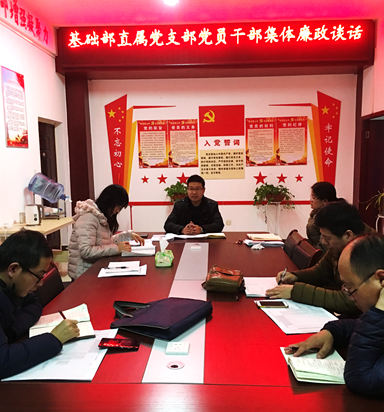 根据《中共黄河水利职业技术学院委员会关于开展2018年“党风廉政主题教育月”活动的通知》(黄院党[2018]74号)文件要求,基础部直属党支部于2018年12月10日在党员活动室开展党员领导干部集体廉政谈话,部副主任唐仙芝及各科室主任参加谈话。
