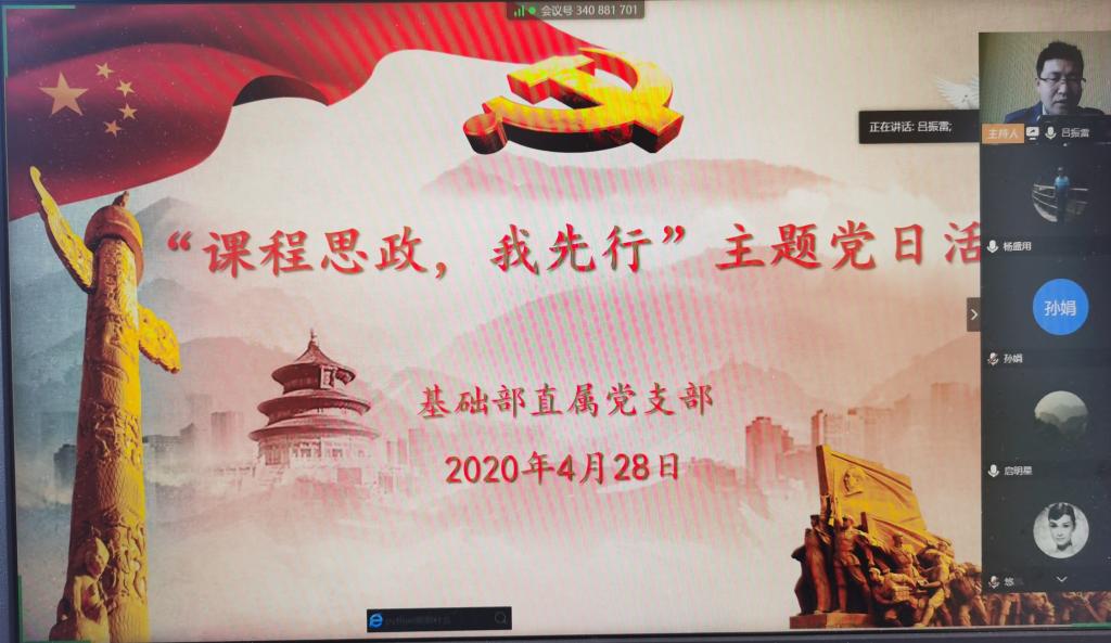 为进一步推进公共基础课程思政教育教学改革与探索,在党员教师中率先推进与实践,4月28日下午,基础部直属党支部全体党员通过网络视频会议开展“课程思政,我先行”主题党日活动,会议由支部书记吕振雷主持。