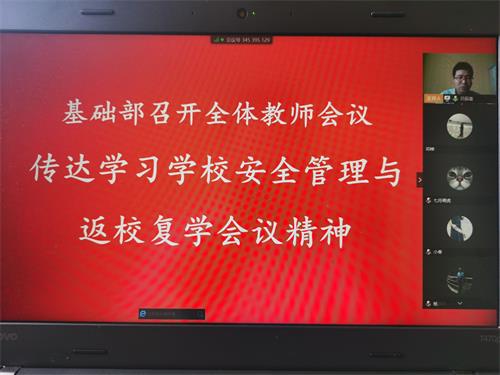 5月12日下午,基础部组织召开全体教师网络视频会议,集中传达“学校安全管理及返校复学工作会议”精神。会议由基础部主任吕振雷主持,全体教师通过网络视频平台参加会议。