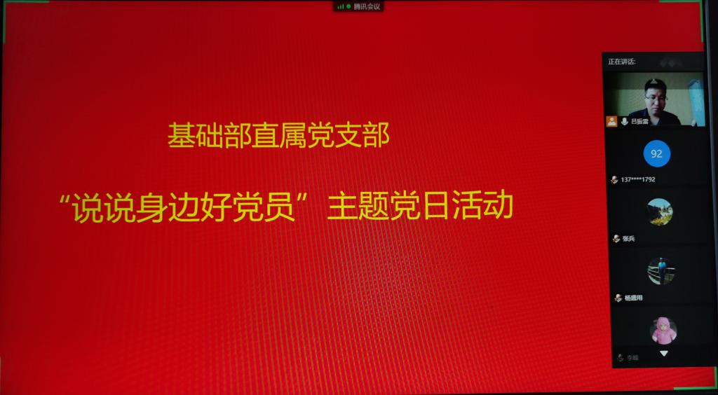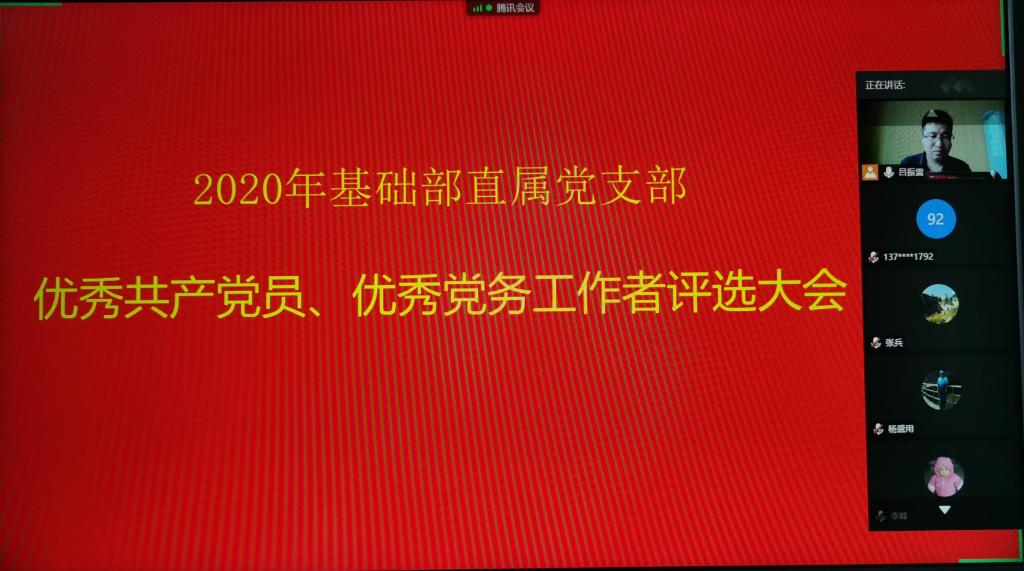 根据《关于做好2020年度先进基层党组织、优秀共产党员和优秀党务工作者评选工作的通知》(黄院党[2020]24号)精神、《中共黄河水利职业技术学院委员会庆祝中国共产党建党99周年活动方案》(黄院组[2020]6号)工作要求,结合基础部直属党支部实际,6月16日下午,通过线上视频会议,组织开展“说说身边好党员”主题党日活动及优秀党员、优秀党务工作者评选活动,全体党员参加,会议由直属支部书记吕振雷主持。