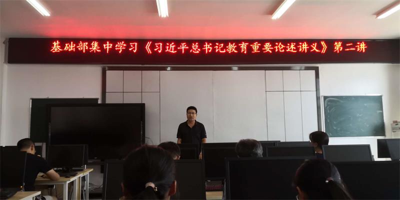根据学校政治理论学习及思想道德教育计划安排,9月8日下午,基础部全体教师在SY5522集中学习《习近平总书记教育重要论述讲义》第二讲:培养担当民族复兴大任的时代新人——坚持把立德树人作为根本任务。会议由部主任吕振雷主持,全体教师参加学习。