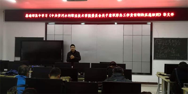 12月1日下午,基础部直属党支部在党员活动室开展意识形态责任制及网络意识形态责任制实施细则等集中学习。会议由主任吕振雷主持,部全体教师参加学习。