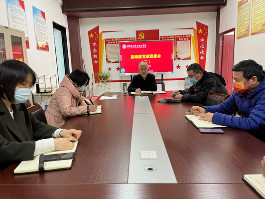 2022年3月29日下午,在基础部党员活动室(5518),召开例行党政联席会。会议由基础部主任兼党支部书记忘记王建设主持,党政办公室主任、教研室主任、实训室主任以及纪检委员参加了会议。