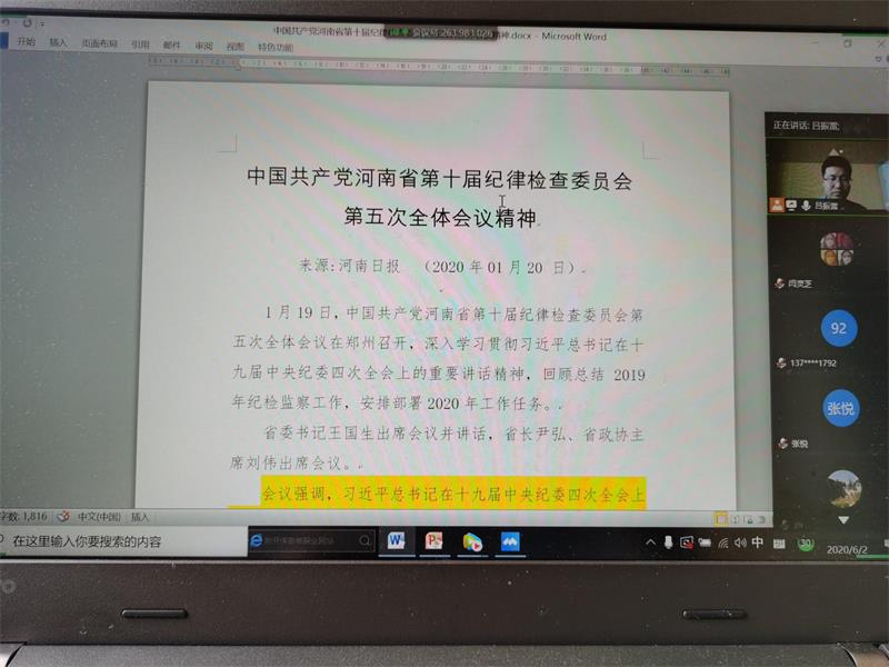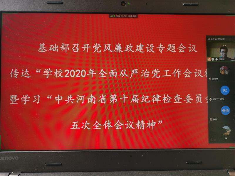 6月2日下午,基础部通过网络平台组织召开党风廉政建设专题视频会议,会议由基础部主任兼直属支部书记吕振雷主持,全体党员及科级以上干部参加。