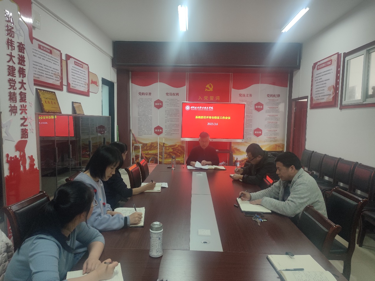 3月6日,基础部召开安全稳定工作会议,会议由王建设主任主持,基础部科级以上干部参加会议。