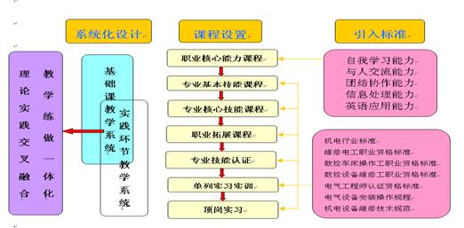 1998年以来,以加强实践教学环节为切入点,加强专业能力培养,改革课程体系,独立设置实践教学体系。2003年,机电一体化技术专业以推行“双证书”制度为切入点,在加强实践教学的同时,将职业资格标准融入专业课程,构建课程体系,形成了体现职业能力培养的人才培养方案。