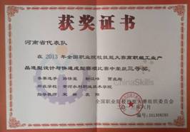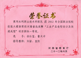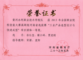 2012年 2013年 连续两年荣获河南省“工业产品造型设计及快速成型”项目一等奖