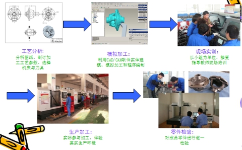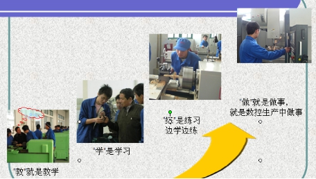 加强了实践教学,突出了“教学练做”一体化的教学模式。教学生产一体化是指构建有工学结合特色的能力主导型的课程体系,开发基于工作过程的能力培训课程,建设有真实生产环境的校内实习基地,教师教学是边讲理论边实践,“理实合一”,教学内容是典型化的企业生产岗位工作任务,学生实训是机械加工的真实生产环境和真实工作内容,学生的考核实施了结合职业考核标准与企业生产岗位考核标准的专业技能考核标准与认证系统,真正实现了 “教学生产一体化”。
