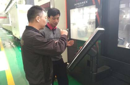万元购买数控高端机床,包括一台数控五轴加工中心和一台数控车铣复合加工中心,我校印尼留学生沙一等很感兴趣,数控团队牺牲节假日,积极培训勤奋好学的留学生,取得了不错的效果。