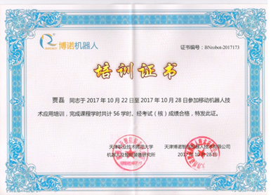2017年10月22日-28日,机械工程学院机电教研室贾磊、张宏祥老师赴天津博诺智创机器人技术有限公司参加了为期7天56学时的“移动机器人技术应用”培训。