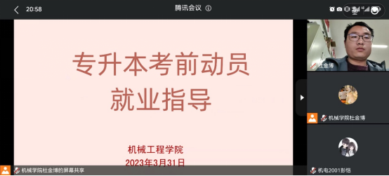 3月31日下午四点半,20级辅导员杜金博通过线上会议举行专升本考前动员、就业指导会,机电、机器人、模具等专业的同学参加了本次会议。