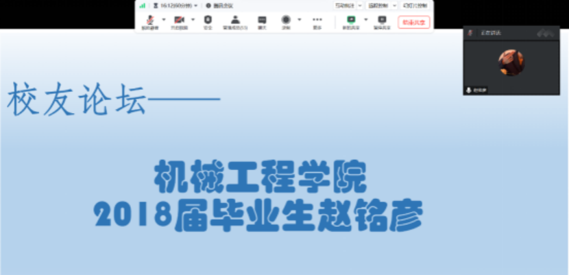 2024年5月30日,机械工程学院举办线上校友论坛,邀请我院2018届毕业生赵铭彦为学生围绕毕业后工作心得和经验体会做分享。