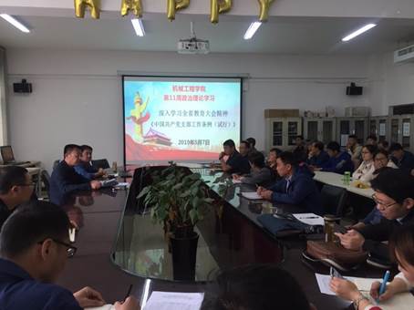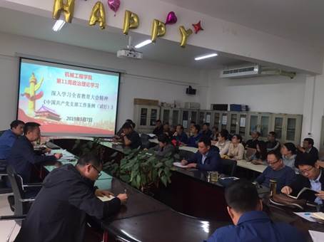 按照校党委宣传部2019年上半年政治理论学习计划安排,5月7日下午,机械工程学院在SY5211会议室开展了第十一周政治理论学习活动,学习内容为“全省教育大会精神”和《中国共产党支部工作条例(试行)》,院领导班子成员及全体教职工参加学习活动。会议由院长谷礼新主持。