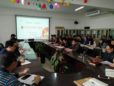 孙天星书记传达了学校的指示精神,指出在以习近平同志为核心的党中央正确领导下,按照中央关于修改宪法的建议,十三届全国人大一次会议高票通过宪法修正案,完成了宪法修改的崇高任务,为新时代坚持和发展中国特色社会主义提供有力宪法保障。我们要认真学习领会中央精神,积极贯彻落实市委部署,把学习宣传贯彻宪法与学懂弄通做实习近平新时代中国特色社会主义思想和党的十九大精神紧密结合起来,坚决维护习近平总书记核心地位,坚决维护党中央权威和集中统一领导,增强全民宪法意识,大力推动和保证宪法实施。