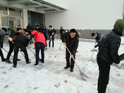 1月5日上午机械工程学院全体师生志愿者将4号实训楼前积雪清扫干净