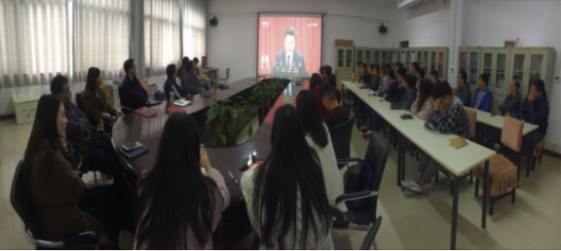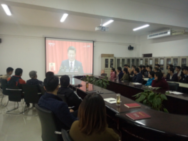 全体师生认真听取习近平总书记铿锵有力的报告,现场不时爆发热烈的掌声,“党的十九大是我党历史上非常重要的一次盛会,是全国人民乃至全世界人民都高度关注的大会,是实现中华民族伟大复兴中国梦的誓师大会。党的十八大以来,以习近平同志为核心的党中央领导中国人民高举中国特色社会主义伟大旗帜,在各条战线上均取得了举世瞩目的成就。这充分证明了中国共产党的伟大、光荣、正确。在场的师生党员纷纷表示,一定要紧跟习近平同志为核心的党中央,继续发挥党员作用,传递正能量,永做一名合格党员。”