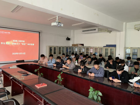 为深入学习贯彻习近平新时代中国特色社会主义思想,引导广大党员、积极分子知史爱党、知史爱国。10月15日下午,机械工程学院学生机械工程支部在sy5211会议室举行了以学习党史、新中国史、改革开放史、社会主义发展史为主题的“学四史”知识竞赛活动。学生机械工程支部全体党员、2020年下半年发展对象和积极分子参加了本次活动。