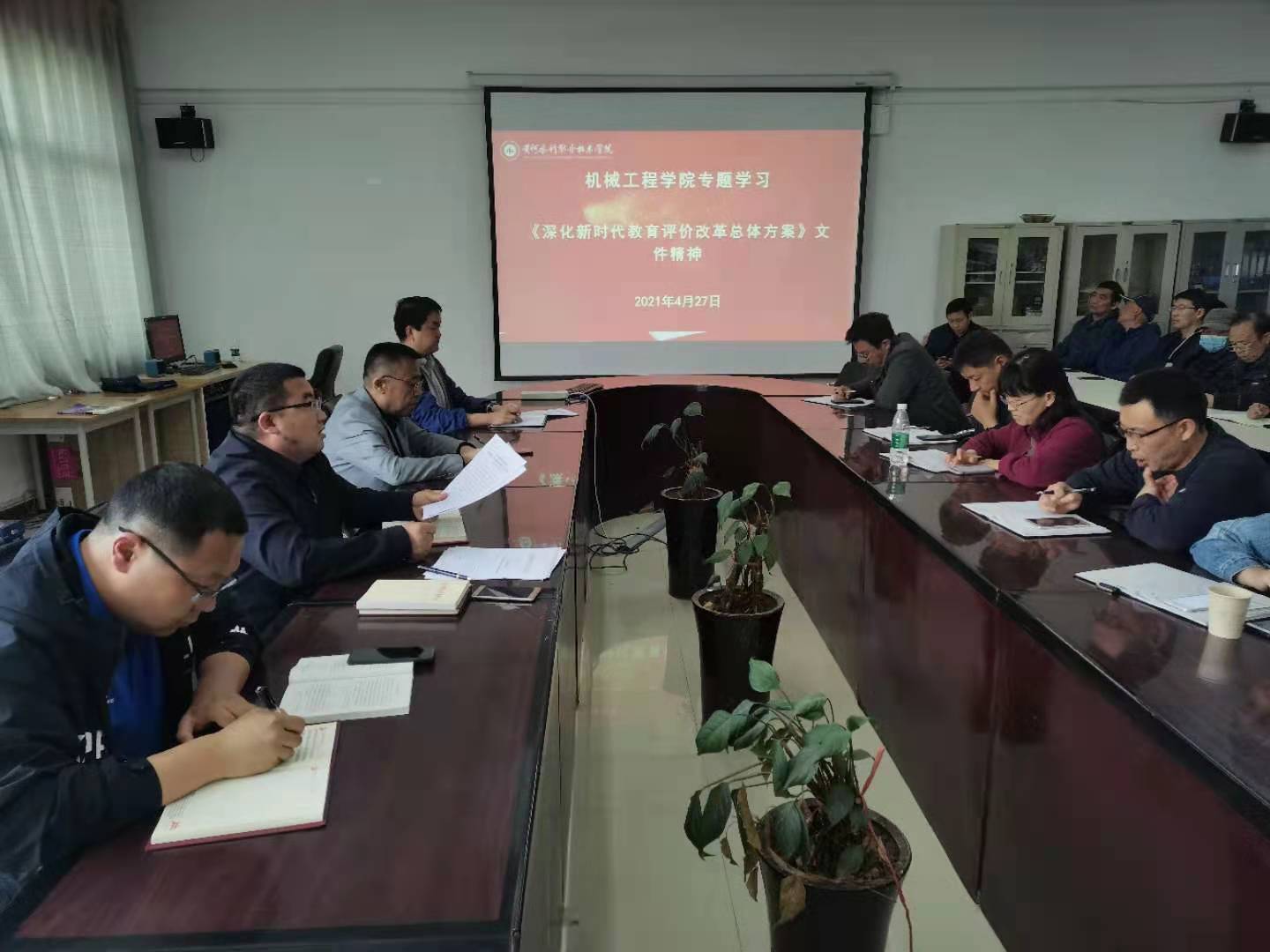 4月27日下午,机械工程学院在院SY5211室组织政治理论专题学习活动,深入学习《深化新时代教育评价改革总体方案》文件精神(以下简称“《总体方案》”),安排部署贯彻落实《总体方案》相关工作。学院全体教职工参加学习活动,学习会由院党总支书记王振强主持。
