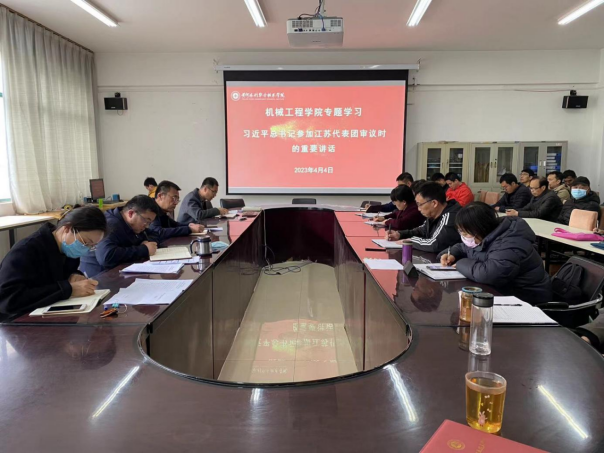4月4日下午,机械工程学院在5号实训馆5211会议室组织专题学习活动,深入学习研讨习近平总书记参加江苏代表团审议时的重要讲话,学院全体教职工参加学习会。学习会由院党总支书记王振强主持。