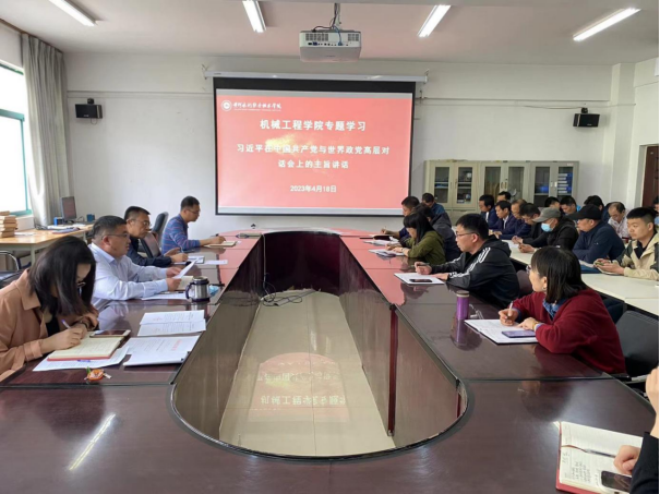 4月18日下午,机械工程学院在5号实训馆5211会议室组织专题学习活动,深入学习研讨习近平在中国共产党与世界政党高层对话会上的主旨讲话,学院全体教职工参加学习会。学习会由院党总支书记王振强主持。