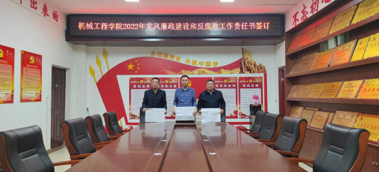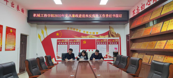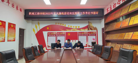 为进一步加强学校党风廉政建设和反腐败工作,不断提高党员领导干部廉洁自律意识,10月18日下午,机械工程学院在SY5212党员活动室举行2022年党风廉政建设和反腐败责任书签字仪式。签字仪式由院党总支书记王振强主持。