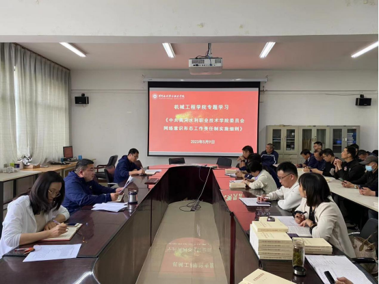 5月9日下午,机械工程学院在5号实训楼5211会议室开展专题学习活动,深入学习《黄河水利职业技术学院党委网络意识形态工作责任制实施细则》,学院全体教职工参加学习会。学习会由院党总支书记王振强主持。