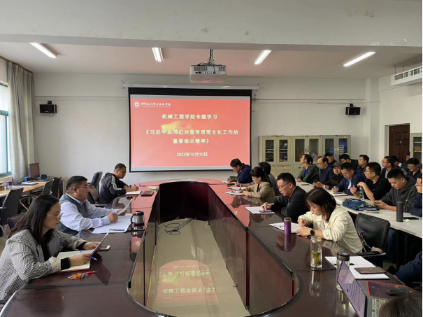 10月10日下午,机械工程学院在5号实训馆5211会议室组织专题学习活动,深入学习研讨习近平总书记对宣传思想文化工作的重要指示精神,学院全体教职工参加学习会。